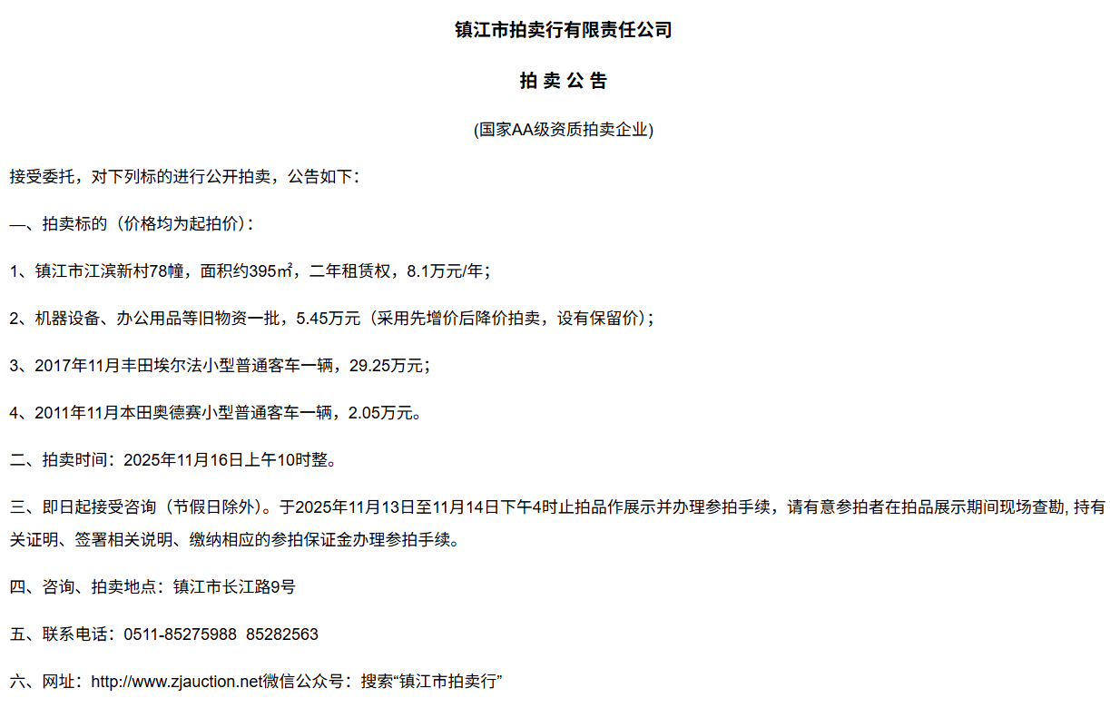 鎮江市拍賣行有限責任公司拍 租 公 吿(國家AA級資質拍賣企業)接受委托,對下列標的進行公開拍租(三拍),公告如下:—、拍租標的(以下價格均為半年至3年租賃權起拍價):1.  建行揚中豐裕支行營業網點二、三、四層經營用房(揚中市三茅鎮三豐南路5號),租賃面積約1080㎡,每層面積約360㎡,三拍底價11.98萬/年(0.3元/平方米/天)。2.  建行揚中油坊支行營業網點三、四層經營用房(揚中市油坊鎮太陽路129號),租賃面積約590㎡,每層面積約295㎡,三拍底價5.34萬/年(0.25元/平方米/天)。3. 建行揚中八橋支行營業網點三、四層經營用房(揚中市八橋鎮太平北路29號),租賃  面積約400㎡,三層約185㎡,四層約215㎡,三拍底價4.43萬/年(0.25元/平方米/天)。以上3套房產均可分層部分出租,拍租價=拍租面積*每平方米每天的租賃單價4. 建行鎮江團山路支行營業網點一層經營用房(鎮江市檀山路8號60幢102、103室),租賃面積約597.09㎡,三拍底價34.52萬/年。5. 建行丹陽原賢橋分理處營業用房(丹陽市城河路15-21號),租賃面積約93.88㎡,二拍底價7.16萬/年。二、拍租時間:2025年11月23日上午10時整。三、即日起接受咨詢(節假日除外)。于11月17日至11月21日下午4時止拍品作展示并辦理參拍手續,請有意參拍者在拍品展示期間現場查勘,持有關證明、簽署相關說明、繳納相應的參拍保證金辦理參拍手續。四、咨詢、拍租地點:鎮江市長江路9號五、聯系方式:0511-85275988   13655299933楊先生六、網址:http://www_zjauction_net.jjegou.com;微信公眾號:搜索“鎮江市拍賣行” 拍品清單2025.11.23序號名稱起拍價(元)標的說明1建行揚中豐裕支行營業網點二、三、四層經營用房(揚中市三茅鎮三豐南路5號),租賃面積約1080㎡,每層面積約360㎡三拍底價11.98萬/年(0.3元/平方米/天)1、1-3號房產均可分層部分出租,拍租價=拍租面積*每平方米每天的租賃單價;2、意向競拍人在拍賣前需持營業執照或身份證與委托方說明租賃房產經營業態,確定意向后出具房產承租用途承諾書,經委托方審核后,方可交納保證金參加競拍;3、租賃期限為半年至3年(承租方與出租方協商而定),承租方每半年或一年結付租金,租賃期間的水、電費用及其它相關費用均由承租方承擔;4、承租方不得用于經營和保管危險物品,不得用于開設餐飲、娛樂等可能嚴重影響消防安全、運營安全的經營業態,不得用于經營委托貸款、小額貸款等可能冒用委托方名義,帶來聲譽風險的經營業態。租賃期內,承租方不得破壞墻體結構,自行成就消防、安全等使用條件,不得擅自將租賃房屋轉租、轉讓給他人使用,否則委托方有權收回房屋;5、拍租成交后,承租方將租金交至出租方指定賬戶,傭金交至拍賣方賬戶(拍租傭金為該房屋一個月租金)。承租方憑租賃合同無息退還保證金。2建行揚中油坊支行營業網點三、四層經營用房(揚中市油坊鎮太陽路129號),租賃面積約590㎡,每層面積約295㎡三拍底價5.34萬/年(0.25元/平方米/天)3建行揚中八橋支行營業網點三、四層經營用房(揚中市八橋鎮太平北路29號),租賃面積約490㎡,每層面積約245㎡三拍底價4.43萬/年(0.25元/平方米/天)4建行鎮江團山路支行營業網點一層經營用房(鎮江市檀山路8號60幢102、103室),建筑面積約597.09㎡三拍底價34.52萬/年5建行丹陽原賢橋分理處營業用房(丹陽市城河路15-21號),建筑面積約93.88㎡二拍底價7.16萬/年